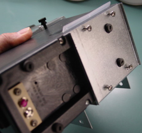 First, slip one hopper extension on the basic feeder. Then, slip one 4-40 fine thread screw through one washer and into the lower end of the extension which will be next to the bracket, and tighten securely. Next, install 4 ea. #6 x 3/8" long screws making sure the rubber feet protrude through the 2 holes in the bracket. Install the retaining strap (right) with the small 4-40 fine thread screw into the hopper extension. Do not use a washer under this screw. You can then attach the strap to the bracket and into a 2 x 4 using two of the 4 supplied #8 x 1/2" long screws. If you mount it to a pipe, you will need to use a couple of screws and nuts to tighten the strap to the bracket (not supplied). Additional straps may be purchased and attached to upper hopper extension to stabilize stacked extensions. Each feeder also has a small plastic loop clamp (not pictured) under the feeder and in the recessed area, which you can use to secure the power adapter cord, whether is is plugged into the jack or attached to the terminal strip. You should not use the feeder's side jack plug outdoors because it may let water in the electronics compartment.
